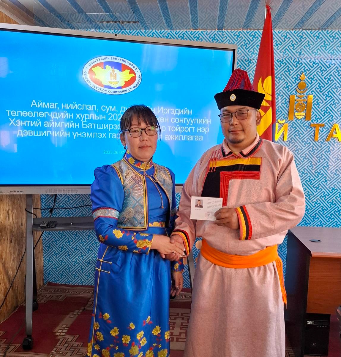 Аймаг, нийслэл, сум, дүүргийн иргэдийн Төлөөлөгчдийн Хурлын 2025 оны 4 дүгээр тойргийн нөхөн сонгуульд МАН-аас нэр дэвшигч Гомбодоржийн Гансүх, АН-аас нэр дэвшигч Балжиннямын Ариунаа нарт нэр дэвшигчийн үнэмлэхийг хуулийн хугацаанд Сонгуулийн хорооны дарга Д.Бүдханд гардуулан өглөө. АН-аас нэр дэвшигч Б.Ариунаа нь байхгүй байгаа тул намын дарга Б.Алтангэрэл үнэмлэхийг хүлээн авсан.