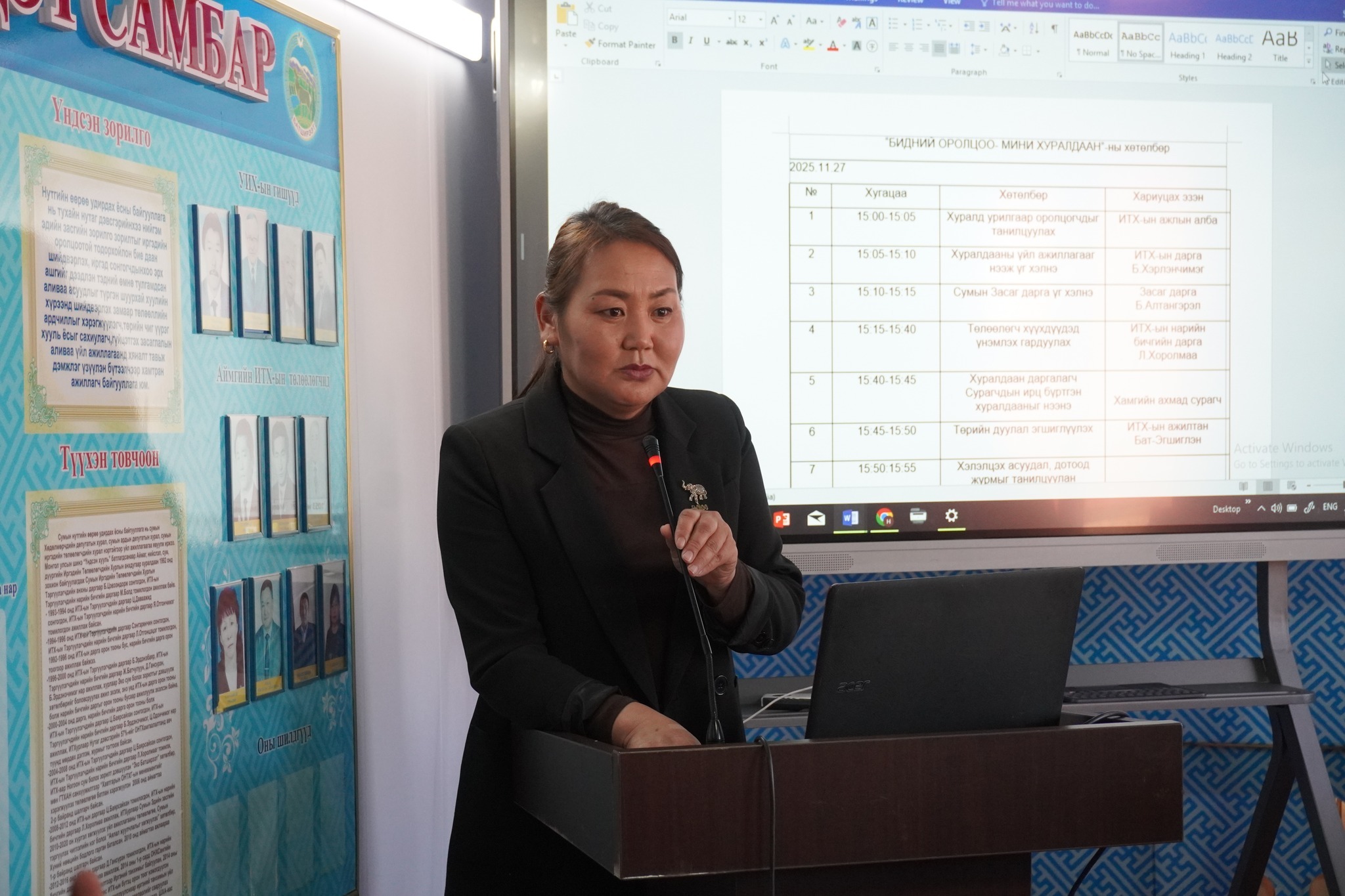 2025 оны 11 дүгээр сарын 27-ны өдөр ЕБС-ийн 6-9 дүгээр ангийн 21 төлөөлөгч сурагчдын дунд Мини хуралдааныг зохион байгуулж дотоод зохион байгуулалт болон хүүхдүүдийн эрэмбэлж гаргаж ирсэн саналуудыг хэлэлцсэн.
